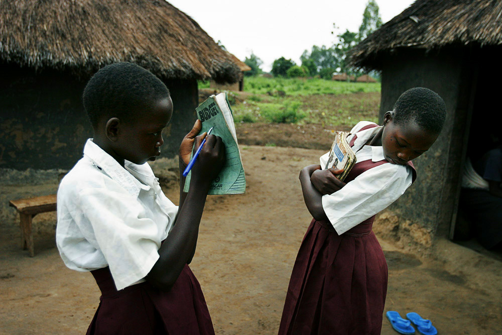 LALIYA, UGANDA MAY 27: Susan Labol, age 10, and her sister Gladys, age 12, waits outside the family hut as they are preparing to walk to school on May 27, 2005 in Laliya, Uganda. They are night commuter, two of about 20,000 children that sleep in Gulu town, as they are afraid of being abducted by the LordÕs Resistance Army (LRA). The rebel group has brought terror to Northern Uganda for almost twenty years, fighting the Ugandan government. The victims are usually children, which are abducted and used as child soldiers and sex slaves. Susan and Gladys walk 1,5 hour from their home every day to sleep at NoahÕs Arch, an NGO housing children in Gulu. They are too afraid of sleeping in the village as an older sister was earlier abducted. They walk a further 30 minutes every day to attend school in a nearby village.