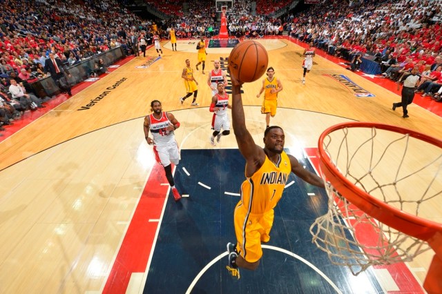 Lance Stephenson of the Indiana Pacers dunks against the Washington Wizards in Game Six of the Eastern Conference Semifinals during the 2014 NBA Playoffs on May 15, 2014 at the Verizon Center in Washington, DC.