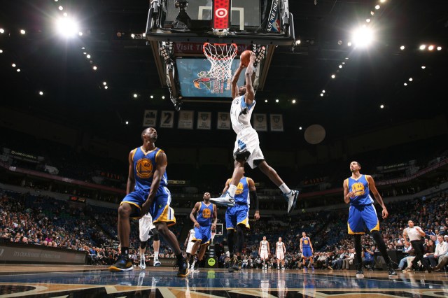 Andrew Wiggins of the Minnesota Timberwolves dunks against the Golden State Warriors on December 8, 2014 at Target Center in Minneapolis, Minnesota.