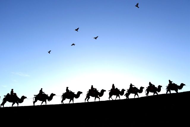 Tourists ride camels at Mingsha Mountain Dunes (Singing-Sand Dunes) scenic spot in Dunhuang, northwest China’s Gansu Province, the first day of the National Day holidays, Oct. 2, 2015. (Zhang Xiaoliang/Xinhua via ZUMA Wire)