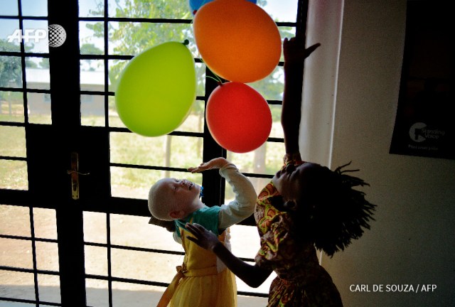 Tanzania, Nansio : TOPSHOT – An albino girl plays with balloons, on