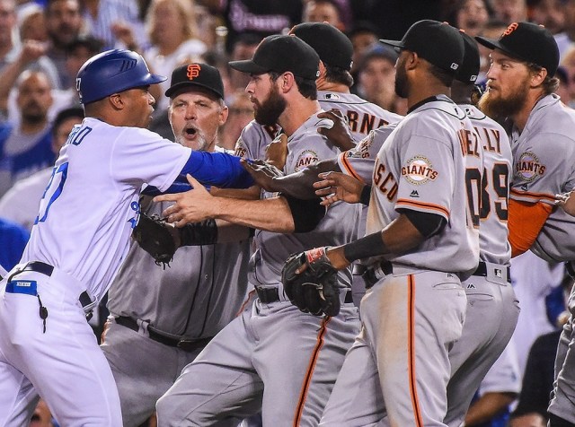 Los Angeles Dodgers’ George Lombard gets in-between Yasiel Puig and San Francisco Giants’ Brandon Belt and Madison Bumgarner after words were exchanged after the final out of the seventh inning of the game at Dodger Stadium on September 19, 2016 in Los Angeles, California. (Jayne Kamin-Oncea/Getty Images)