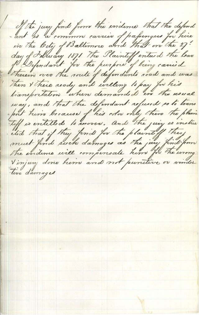 In the 1860s and 1870s, the Baltimore City Passenger Rail Road Company enforced their rule that allowed white passengers to sit in any car, but restricted black passengers to only the cars marked with signs that permitted black passengers. About one car permitted black passengers for every three cars that permitted white passengers. After paying his fare on February 27, 1871, John W. Fields was ejected from a car which did not allow black passengers. As can be seen in this document, Judge Bond charged the jury that if the company refused to transport Fields solely because he was black, he should be awarded damages. The jury ruled in Fields’ favor, resulting in a victory for African Americans in the fight for equal rights after the Civil War. According to some historians, this case facilitated the end of segregation on trolleys in Baltimore for a period, as many trolley companies found it too expensive to provide separate but equal accommodations for African Americans and white passengers.