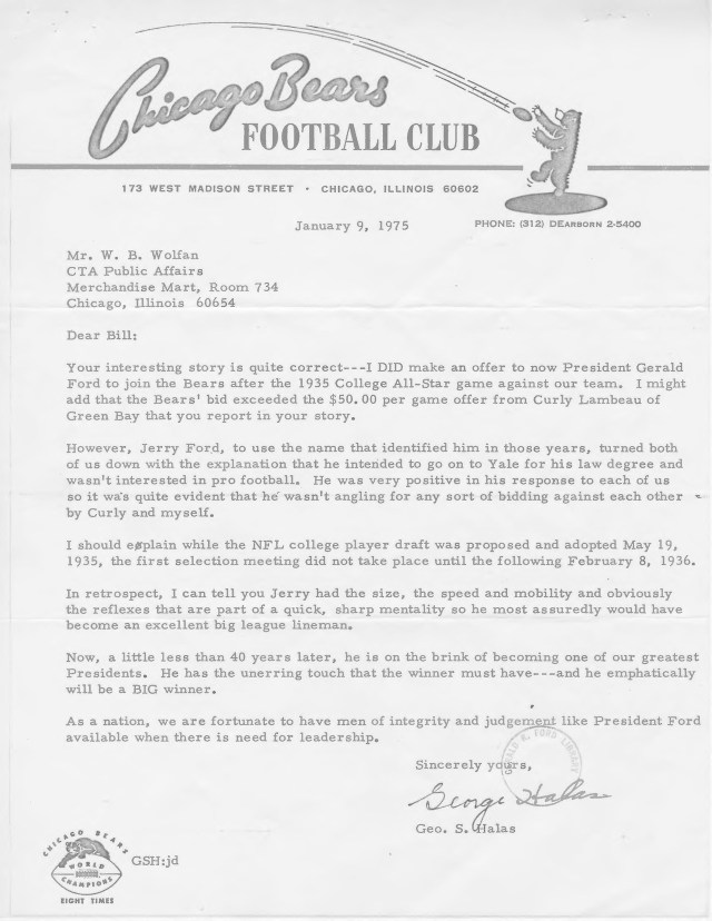 President Ford received a copy of the Halas letter and an article about his football career from Bill Wolfan, a friend from Grand Rapids who met young Jerry Ford while covering high school sports for the Grand Rapids Herald. Wolfan went on to work in the Public Affairs Department at the Chicago Transit Authority (CTA), which also had charge of Soldier Field, home stadium for the Chicago Bears.