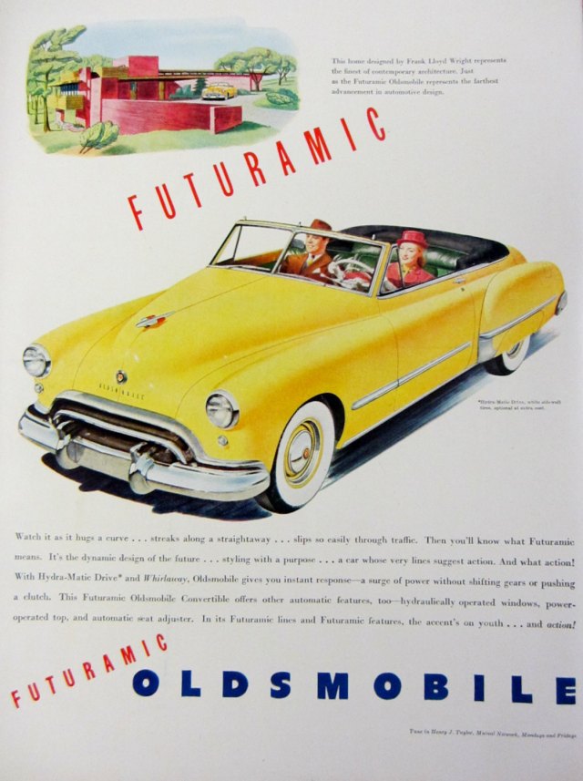 “This home designed by Frank Lloyd Wright represents the finest of contemporary architecture. Just as the Futuramic Oldsmobile represents the farthest advancement in automotive design.”