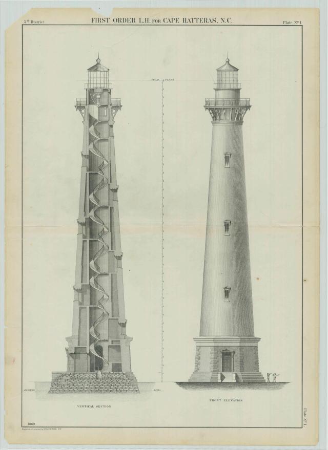 The Cartographic Branch holds a variety of lighthouse drawings. The drawing above shows the First Order Lighthouse for Cape Hatteras, North Carolina. Note that the iconic black and white striping is missing from this illustration, which is dated 1869. Our collection also holds many additional plans and drawings related to the Cape Hatteras Lighthouse.