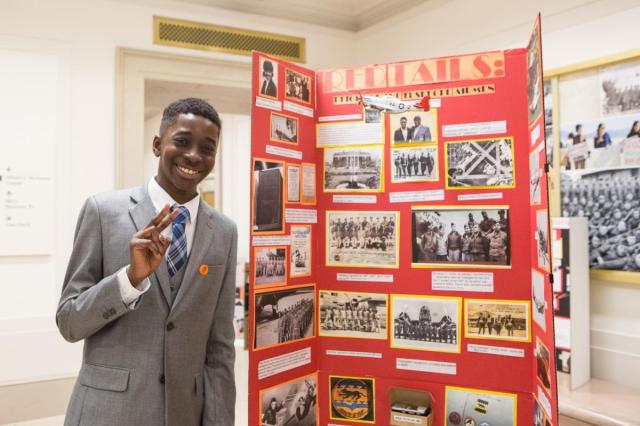 A National History Day participant poses with his National History Day “Red Tails” exhibit during the competition held at the National Archives in Washington, DC, on April 11-12, 2018. (National Archives photo, Jeffrey Reed)